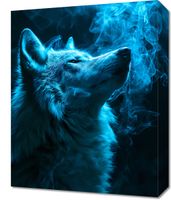 Obraz z serii natura zatytułowany Oddech Wilka przedstawia majestatycznego wilka odsłaniającego głowę ku niebu, otoczonego przez eteryczny, niebieski dym, który wydaje się być przedłużeniem jego oddechu. Sylwetka zwierzęcia jest wyraźna i dynamiczna, a jego futro jest ukazane z niesamowitą szczegółowością, każdy włos wydaje się lśnić w tajemniczym, błękitnym świetle. Dym dodaje kompozycji mistycznego klimatu, a intensywny niebieski kolor sprawia, że całość nabiera głębi i charakteru. Obraz ten doskonale sprawdziłby się jako element dekoracyjny w przestrzeniach inspirowanych naturą, takich jak domowe biblioteki, pokoje relaksu, czy studia jogi, a także jako akcent w nowoczesnych, miejskich loftach dla miłośników dzikiej przyrody i ducha wolności.