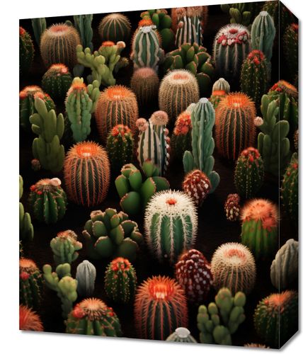 Obraz z serii natura zatytułowany Ogród Kaktusów. Prezentuje on bogatą kolekcję kaktusów w różnych odcieniach zieleni, czerwieni i pomarańczy, które wyłaniają się z głębi czarnego tła, nadając kompozycji głębi i intensywności. Różnorodność kształtów i faktur roślin w połączeniu z ich naturalnymi barwami tworzy wizualną ucztę, podkreślającą piękno i różnorodność tych wytrzymałych roślin. Obraz ten jest idealnym dodatkiem do wnętrz o tematyce przyrodniczej, takich jak oranżerie, pokoje wypoczynkowe, czy współczesne przestrzenie biurowe, wprowadzając element organiczny i żywy do każdego otoczenia. To także wspaniała inspiracja dla miłośników sukulenty i pustynnej flory.