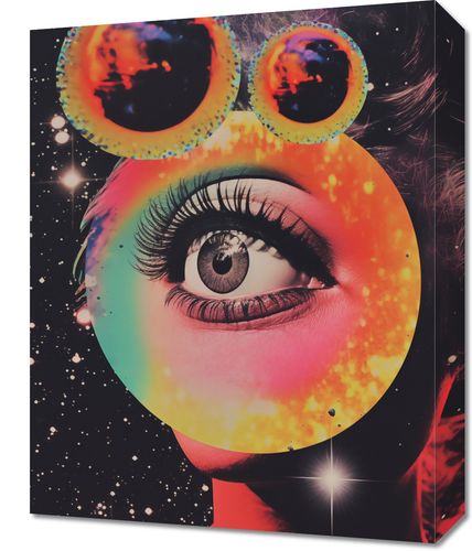 Obraz z serii pop art zatytułowany Oko w Kosmosie. Ten dynamiczny obraz to połączenie surrealistycznego portretu i kosmicznej odyseji. Centralnym punktem jest oko, które jest zarówno oknem na duszę, jak i lustrzanym odbiciem wszechświata, otoczone przez płomienne kolory galaktycznej mgławicy. Nad okiem widnieją okulary przeciwsłoneczne, w których lustrzanych szkłach odbijają się planety, nadając kompozycji głębi i zadziwiającej perspektywy. Ten obraz, pełen barw i kontrastów, to wspaniały wybór dla tych, którzy pragną dodać odrobinę kosmicznego surrealizmu do swojego wnętrza, idealnie sprawdzając się w przestrzeniach artystycznych, takich jak galerie sztuki, studia projektowe lub awangardowe salony.