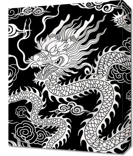 Obraz z serii motywy wschodnie zatytułowany Orient przedstawia dynamiczną i szczegółową ilustrację smoka w stylu orientalnym, wypełniającego większość kompozycji na czarnym tle. Smok jest przedstawiony w tradycyjnej chińskiej estetyce, z wydłużonym ciałem pokrytym łuskami, długim, zakręconym wiatrem, ostrymi pazurami i wyrazistymi rysami twarzy. Wykorzystanie kontrastowych bieli i czerni wzmacnia graficzny charakter ilustracji, podkreślając wyrafinowane detale i płynność ruchów smoka. Jego ciało płynnie przenika przez chmury i wiry dymu, co dodaje kompozycji wrażenia głębi i ruchu. Ta praca może symbolizować moc, mądrość i ducha przemiany, które są często kojarzone ze smokami w kulturze wschodniej. Idealnie nadawałby się jako element dekoracyjny w przestrzeniach, które chcą nawiązać do azjatyckiej kultury lub dodać silny, energiczny akcent do swojego otoczenia.