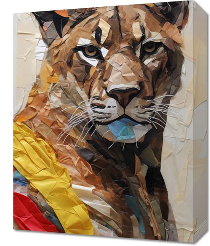 Obraz z serii wnętrza zatytułowany Papierowy Tygrys. Ta oryginalna i kreatywna ilustracja przedstawia portret tygrysa wykonany techniką kolażu z kolorowych kawałków papieru. Wykorzystanie różnych odcieni i tekstur papieru nadaje dziełu głębi i dynamiki, a jednocześnie zachowuje realistyczny obraz dzikiego zwierzęcia. Obraz ten jest wyjątkowym dziełem sztuki, które przyciąga wzrok i inspiruje, idealny dla miłośników natury i oryginalnego designu, świetnie sprawdzi się w nowoczesnych salonach, gabinetach lub jako wyrazisty akcent w przestrzeniach publicznych takich jak galerie sztuki czy kawiarnie.