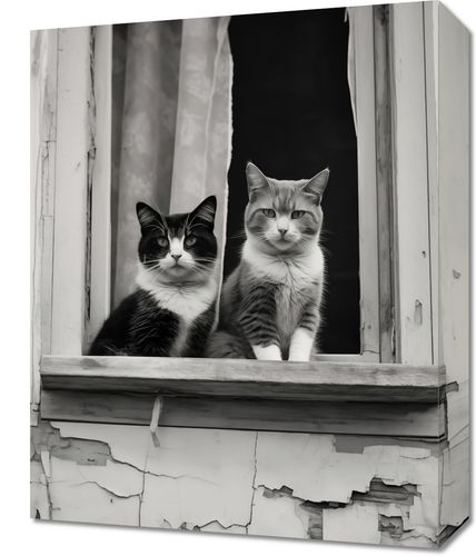 Obraz z serii wnętrza zatytułowany Para w Oknie. Uchwycenie momentu, w którym dwa koty o spokojnych i pełnych godności spojrzeniach pozują w oknie zaniedbanej fasady. Czarno-białe tło fotografii dodatkowo wzmacnia ich wyraziste, charakterystyczne wzory na sierści. Ten obraz to nie tylko urokliwa scena z życia miejskich kotów, ale również piękna metafora o spokoju i zgodzie, jaką można odnaleźć w najprostszych momentach codzienności. Obraz ten będzie wyjątkowym dodatkiem do każdego wnętrza, szczególnie polecany dla miłośników zwierząt i estetyki vintage, a także jako element ozdobny w kawiarniach czy księgarniach, który wnosi element ciepła i domowego klimatu.