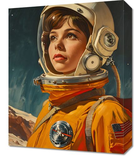 Obraz z serii pop art zatytułowany Pionierka Kosmosu. przedstawia kobietę astronautkę w klasycznym skafandrze kosmicznym, z wizjerem odbijającym gwiazdy i odległą planetę. Jej spojrzenie jest pełne determinacji i odwagi, a zarazem wyraża ciekawość i zadumę nad niewiadomymi, które czekają w głębi kosmosu. Barwy plakatu - bogate złoto skafandra i głęboka czerń przestrzeni kosmicznej - tworzą kontrast, który podkreśla odwagę i piękno eksploracji kosmicznej. Obraz ten jest hołdem dla wszystkich kobiet w historii podboju kosmosu i będzie doskonałą ozdobą dla każdej przestrzeni inspirowanej nauką, od domowych biur po edukacyjne instytucje, a także jako symbol siły i inspiracji dla pokoi młodzieżowych.
