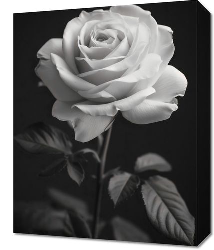 Obraz z serii wnętrza zatytułowany Płatki Róż. Obraz przedstawia ponadczasowy, monochromatyczny obraz róży. Róża, z delikatnymi i szczegółowymi płatkami, jest wyeksponowana na ciemnym tle, co wyostrza jej obrys i podkreśla subtelne niuanse jej formy. Gra światła i cienia nadaje głębi i trójwymiarowości, a ułożenie płatków w pełnym rozkwicie symbolizuje piękno i doskonałość. Liście i łodyga są skromne, ale wyraźne, dodając naturalności całej kompozycji. Obraz oddaje esencję delikatności i elegancji róży, co sprawia, że jest idealny dla każdego, kto szuka elementu dekoracyjnego o subtelnym pięknie i spokojnej, relaksującej estetyce.