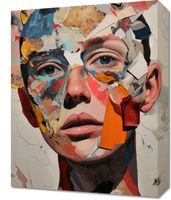 Obraz z serii abstrakcja zatytułowany Podział Samego Siebie, przedstawia twarz złożoną z rozmaitych, nieregularnych kawałków, które łączą się w zaskakująco spójną całość. Każdy fragment jest jak pociągnięcie pędzla, pełne tekstury i żywych kolorów, od ciepłych odcieni pomarańczy i czerwieni, po subtelne biel i brąz. Wzrok widza jest przyciągany do intensywnych, realistycznych oczu, które wydają się obserwować z za rozdrobnionej mozaiki. Obraz ten mógłby znaleźć swoje miejsce w nowoczesnych galeriach sztuki, studiach projektowych, lub jako odważny akcent w minimalistycznych, współczesnych przestrzeniach. Jego abstrakcyjny, ale wyrazisty design stwarza punkt konwersacyjny i może być interpretowany jako komentarz do złożoności ludzkiej tożsamości i percepcji.