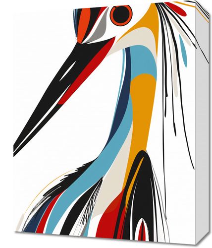 Obraz z serii abstrakcja zatytułowany Portret to abstrakcyjne przedstawienie bociana, w stylu modernistycznej grafiki. Ptak jest przedstawiony przy użyciu odważnych, czystych linii i jasnych, kontrastujących barw, które łączą się w dynamiczną i nowoczesną kompozycję. Linie tworzą zarys ptaka, a kolorowe płaszczyzny - od czerwieni, poprzez błękity, aż po odcienie żółci i czerni - nadają głębi i charakteru jego postaci. Akcenty kolorystyczne, jak czerwone pióro czy niebieski akcent na szyi, dodają dziełu energii i wyrazistości. Obraz jest żywy i pełen charakteru, idealny do wnętrz, które szukają silnego wizualnego akcentu, takich jak współczesne salony, galerie sztuki, czy przestrzenie kreatywne.