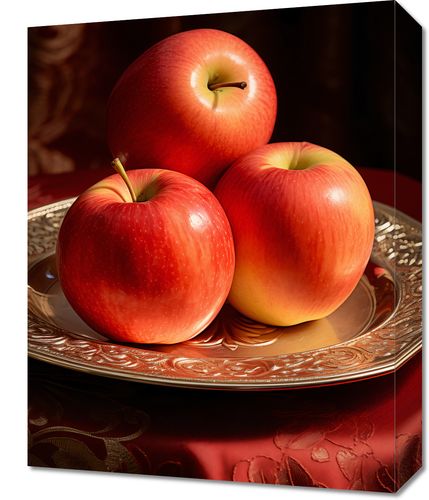 Obraz z serii natura zatytułowany Rubinowe Ekscesy. Trzy soczyste jabłka o lśniącej rubinowej skórce, delikatnie ułożone na antycznym srebrnym talerzu o bogato zdobionych brzegach. Każde jabłko jest uchwycone w pełni swojego naturalnego piękna, z delikatnymi refleksami światła podkreślającymi ich świeżość i kuszący wygląd. Tło z głębokim czerwonym brokatem, dodaje głębi i luksusu kompozycji. Obraz idealnie komponuje się w przestrzeniach kulinarnych, takich jak restauracje wysokiej klasy czy domowe kuchnie, gdzie podkreśla znaczenie estetyki w prezentacji potraw.