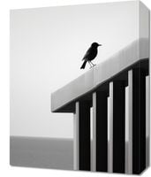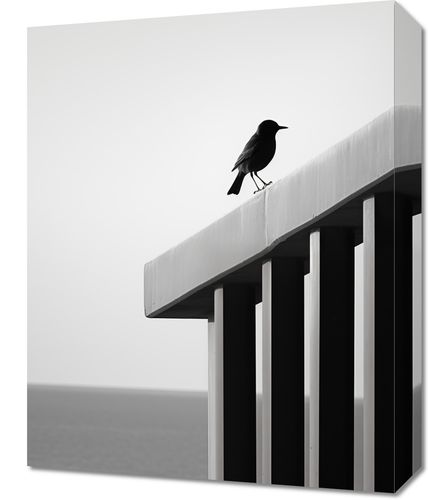 Obraz z serii pejzaże zatytułowany Samotna Odchłań. Ten skrajnie minimalistyczny obraz przedstawia pojedynczego ptaka spoczywającego na czystej, białej krawędzi konstrukcji, z subtelnym tłem nieskończonego morza. Zdjęcie w skali szarości, gdzie tylko kontury ptaka wyróżniają się na jednolitym tle, wywołuje poczucie spokoju i introspekcji. Idealny dla nowoczesnych przestrzeni biurowych i domowych, które pragną oddać hołd prostocie i skupieniu, a także jako przemyślany akcent w galeriach sztuki czy minimalistycznych salonach.