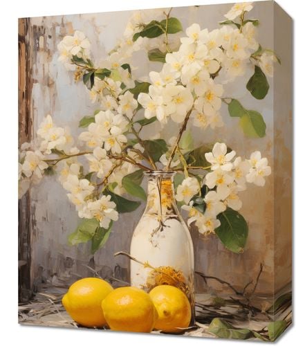 Obraz z serii wnętrza zatytułowany Słodkie Chwile. Delikatne białe kwiaty o subtelnym żółtym środku rozkwitają pełnym blaskiem obok dojrzewających cytryn, które wyróżniają się na tle w delikatnych pastelowych odcieniach. Starannie postarzana butelka i rustykalne drewno dodają nuty nostalgii i spokoju do tej kompozycji. Delikatna gra światła i cienia tworzy głęboką atmosferę i dodaje ciepła do sceny. Świetnie sprawdzi się w kawiarniach o prowansalskim stylu, domowych jadalniach dla tych, którzy pragną dodać do swojej przestrzeni odrobinę wiejskiego uroku, czy też w hotelach, gdzie chce się podkreślić elegancję i ciepło naturalnych elementów.