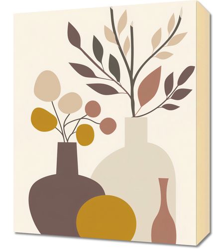 Obraz z serii minimalistyczne zatytułowany Stonowane Naturmorta. Artystyczne przedstawienie klasycznego naturmorta ożywione zostało poprzez minimalistyczne kształty i spokojną paletę barw. Butelki i wazy o prostych formach, wypełnione są stonowanymi okręgami i liśćmi, które przypominają delikatne kompozycje florystyczne. Barwy ziemi – od ciepłych beżów po głębokie brązy – są połączone z subtelnością, tworząc wyrafinowany i spokojny nastrój.Ten obraz doskonale wpisze się w dekorację nowoczesnych, stonowanych wnętrz, gdzie jego elegancja i subtelność mogą być w pełni docenione. Idealny do umieszczenia w salonie, sypialni lub biurze, doda każdemu z tych miejsc ciepła i domowej atmosfery, zachowując przy tym czystość i prostotę linii.