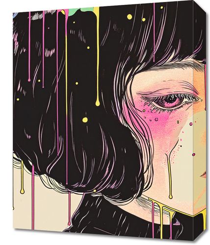 Obraz z serii pop art zatytułowany Strugi Kolorów. Ten hipnotyzujący obraz przedstawia wizerunek młodej kobiety z przymkniętymi oczami, jej twarz zdaje się być na granicy snu i jawy. Nad nią i wokół niej płyną strugi kolorów, które wydają się rozlewać jak ciecz, tworząc atmosferę oniryczną i abstrakcyjną. Kontrast między realistyczną twarzą a surrealistycznym tłem podkreśla emocjonalną głębię i złożoność ludzkich doświadczeń.Obraz ten doskonale uzupełni przestrzeń pełną kreatywności i wyobraźni, taką jak pracownie artystyczne, kawiarnie, czy nawet nowoczesne pokoje młodzieżowe. Może również stanowić niebanalny akcent w pomieszczeniach terapeutycznych lub coachingowych, gdzie rozmowa na temat emocji i wewnętrznego świata jest na porządku dziennym.