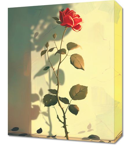 Obraz z serii abstrakcja zatytułowany Subtelność przedstawia pojedynczą, kwitnącą różę w subtelnie oświetlonym pomieszczeniu, które wprowadza atmosferę spokoju i refleksji. Delikatne światło przesączające się przez okno rzuca cienie liści na blady, ciepły tło, co nadaje scenie głębi i tekstury. Rozwinięty kwiat róży w pełnym rozkwicie, o intensywnie czerwonym kolorze, jest centralnym punktem kompozycji, symbolizującym zarówno delikatność, jak i siłę życia. Opadające płatki wokół smukłej łodygi tworzą poczucie ulotnego piękna i przemijania. Ten obraz doskonale sprawdzi się jako dekoracja w przestrzeniach promujących spokój i kontemplację, takich jak salony, pokoje relaksacyjne czy studia jogi.