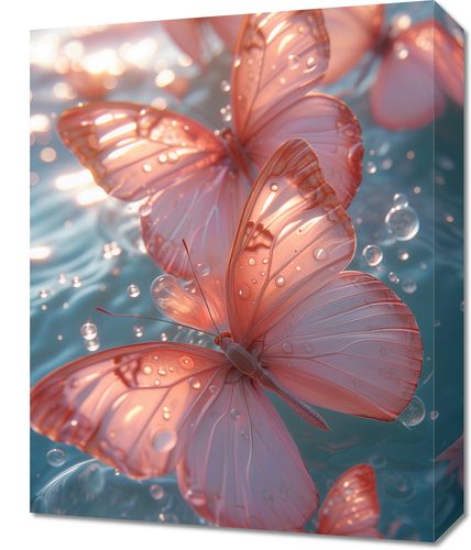 Obraz z serii natura zatytułowany Świetliste Motyle. Na obrazie widzimy delikatne motyle o przezroczystych, różowych skrzydłach, unoszące się nad wodą i łagodnie odbijające światło słoneczne. Kropelki wody na ich skrzydłach dodają uczucia świeżości i czystości. Obraz emanuje spokojem i pięknem, idealnie nadając się do przestrzeni, które chcą wprowadzić element relaksu i spokoju, takich jak spa, pokoje medytacyjne, a także jako łagodny element dekoracyjny do domu.