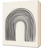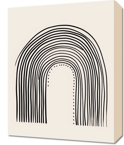 Obraz z serii boho zatytułowany Symetria Łuku. Grafika jest kwintesencją graficznej symetrii, przedstawiając hipnotyzujący motyw łuków, który wyłania się z rytmicznie powtarzających się, czarnych linii na beżowym tle. Kompozycja w formie bramy składa się z koncentrycznych półkoli, tworząc głęboką perspektywę, która przyciąga wzrok i prowadzi go ku centralnej, tajemniczej przestrzeni. Delikatne kropki podkreślają ścieżkę prowadzącą do wewnętrznego centrum, sugerując podróż ku własnej introspekcji. Ten minimalistyczny obraz będzie pasował do wnętrz o współczesnym charakterze, gdzie jego klarowna estetyka może stanowić przeciwwagę dla zgiełku codzienności, a także do przestrzeni w stylu zen, gdzie może wspomagać medytację i spokój umysłu.