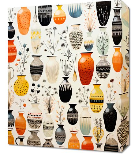 Obraz z serii wnętrza zatytułowany Symfonia Wazonów. Wspaniałe wazony w bogatej palecie kolorów, od głębokiej czerni do ciepłych odcieni pomarańczu, tworzą intrygującą mozaikę wzorów i kształtów. Delikatne motywy roślinne, które zdobią niektóre wazony, dodają uroku i lekkości, a różnorodność wzorów i faktur przyciąga wzrok i zaprasza do głębszej refleksji. Kontrast między jasnymi i ciemnymi barwami, a także subtelne niuanse w każdym wazonie, dodają tej kompozycji głębi i dramatu. Ten artystyczny plakat doskonale wpisuje się w klimat wyrafinowanych galerii sztuki, eleganckich kawiarni oraz nowoczesnych przestrzeni mieszkalnych, które stawiają na unikatowy design.