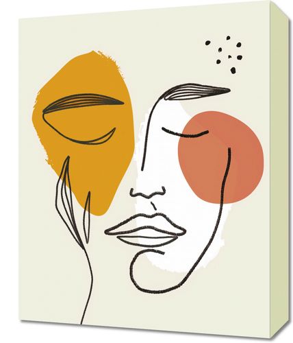 Obraz z serii boho zatytułowany Szept Przestrzeni.Grafika przedstawia abstrakcyjne przedstawienie twarzy, które łączy linearną elegancję z organicznymi kształtami i pastelowymi akcentami kolorystycznymi. Proste linie kreślą spokojne, ale wyraziste kontury twarzy, podczas gdy geometryczne i abstrakcyjne formy w odcieniach pomarańczu i żółci nakładają się, tworząc iluzję głębi i ciepła. Grupa małych czarnych kropek nad głową dodaje element tajemniczości. To dzieło sztuki wnoszące do wnętrza element introspekcji i spokoju, jest idealne dla przestrzeni, które szukają spokojnego akcentu artystycznego. Doskonale nadaje się do umieszczenia w przestronnych, jasnych salonach, przytulnych sypialniach czy medytacyjnych kącikach, wprowadzając atmosferę kontemplacji i spokoju ducha.