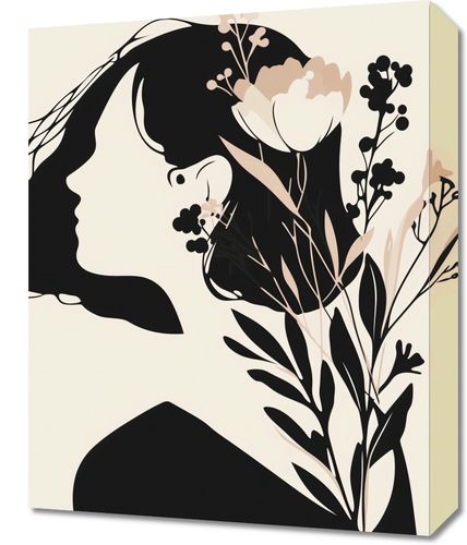 Obraz z serii minimalistyczne zatytułowany Szept w Głębi. Grafika ta prezentuje profil kobiecej sylwetki, z której wyłania się i z nią harmonijnie współgra bukiet delikatnych, stylizowanych kwiatów i liści w kolorach czerni, beżu oraz różnych odcieniach brązu. Jest to gra kontrastów i subtelnego piękna, gdzie człowiek i natura współistnieją w delikatnej równowadze. Ten plakat doskonale wpasuje się w spokojne, kobiece przestrzenie, takie jak sypialnia lub prywatny kącik do czytania. Jego łagodne kolory i prosta forma będą pięknie komponować się z wnętrzami w stylu skandynawskim, boho, czy nowoczesnym, dodając im elegancji i subtelności.