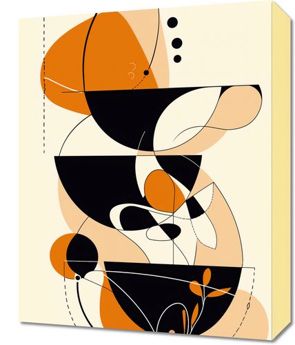 Obraz z serii minimalistyczne zatytułowany Taneczne Kręgi.Ta grafika przyciąga uwagę dynamicznym zastosowaniem form i kolorów. Czarne i pomarańczowe elementy na jasnym tle sprawiają, że kompozycja tętni życiem, podkreślając witalność i ruch. Abstrakcyjne kształty krążą wokół siebie w harmonijnym tańcu, tworząc wizualną symfonię, która może być interpretowana na wiele sposobów. Można doszukać się w nich zarówno organicznych form, jak i bardziej strukturalnych, architektonicznych motywów, co dodaje tej pracy wielowymiarowości. Wydaje się być idealnym uosobieniem nowoczesności z nutą klasyki, mogącym pasować do wielu współczesnych przestrzeni.