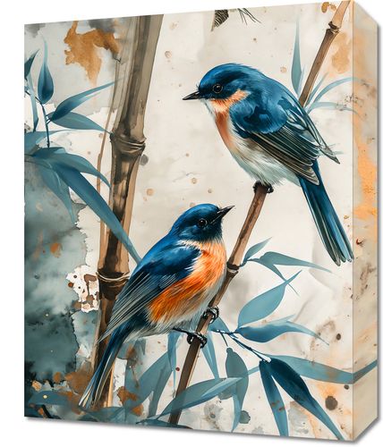 Obraz z serii natura zatytułowany Trzy Ptaki prezentuje trzy ptaki - dwa siedzące spokojnie na bambusowych gałązkach i jednego w locie - na tle akwarelowego, delikatnie zabarwionego krajobrazu. Ptaki, o intensywnie niebiesko-pomarańczowym upierzeniu, są przedstawione z wyraźnymi detalami, które kontrastują z bardziej abstrakcyjnym i eterycznym tłem. Plama akwarelowa łączy w sobie odcienie beżu i szarości, z subtelnymi akcentami złota, co dodaje kompozycji elegancji i lekkości. Ten obraz może przynieść uczucie spokoju i równowagi do każdego wnętrza, idealny dla salonów, przestrzeni wypoczynkowych, a nawet biur, gdzie naturalna piękność i spokój są cenione.