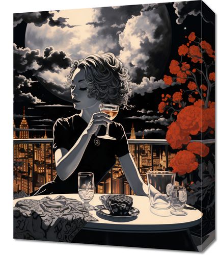 Obraz z serii pejzaże zatytułowany Wieczorne Toasty. Zadziwiająca kobieta o falujących włosach siedzi przy stole, unosząc kieliszek w towarzystwie wielkiego, olśniewającego księżyca. Jej kontury i sylwetka wyróżniają się na tle nocnego miasta, gdzie światła budynków błyszczą w oddali. Pomarańczowe kwiaty dodają życia i koloru do monochromatycznej palety, a ich ciepły odcień kontrastuje z chłodnym blaskiem księżycowego światła. Delikatne detale, takie jak ornamenty na obrusie czy odbicia w szkle, dodają głębi i finezji kompozycji. Idealnie nadaje się do eleganckich kawiarni, restauracji na dachu oraz nowoczesnych apartamentów z widokiem na miasto.