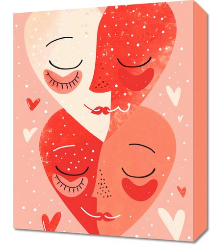Obraz z serii wnętrza zatytułowany Wysoka Wibracja przedstawia dwie połówki serca, które razem tworzą jedno, gdzie każda połówka ma ludzkie rysy twarzy z zamkniętymi oczami, wyrażającymi spokój i radość. Całość utrzymana jest w ciepłej, pastelowej kolorystyce z akcentami czerwieni i różu, a tło wypełniają delikatne elementy w kształcie serduszek, które dodają ilustracji romantycznego nastroju. Obraz symbolizuje jedność, miłość i harmonię, a zamknięte oczy mogą sugerować intymność i zaufanie. Obraz jest idealnym wyrazem miłości i bycia w związku, doskonałym do pomieszczeń domowych, takich jak sypialnie czy salony, a także może stanowić romantyczny prezent dla bliskiej osoby.