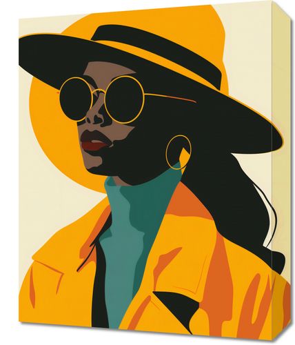 Obraz z serii abstrakcja zatytułowany Żółta Stylowość. Grafika ta portretuje postać kobiety w stylowym, żółtym kapeluszu i okularach przeciwsłonecznych, którego wyraziste linie i bloki kolorów tworzą silny, graficzny obraz. Odcienie żółci, połączone z subtelnymi akcentami zieleni i czerni, nadają kompozycji nowoczesnego i śmiałego charakteru. Postać emanuje pewnością siebie i wyrafinowaniem, co czyni ten obraz idealnym elementem dekoracyjnym dla przestrzeni o współczesnym designie, a także dla miejsca, które chce dodać akcent miejskiej elegancji. Idealny dla salonów modowych, gabinetów kosmetycznych czy nowoczesnych biur kreatywnych.
