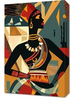Obraz z serii abstrakcja zatytułowany Afrykańska Mozaika. Prezentuje on stylizowany profil afrykańskiej kobiety, ubranej w tradycyjne ozdoby i hełm, który jest równie bogaty w kulturę, co w estetykę. Tło i postać są zbudowane z geometrycznych kształtów i ciepłych, ziemistych kolorów, które oddają bogactwo i różnorodność afrykańskiego dziedzictwa. Złote i czerwone akcenty na postaci kontrastują z spokojnymi odcieniami tła, co podkreśla jej wyjątkowy charakter. Obraz ten będzie doskonałym dodatkiem do wnętrz, które chcą uczcić i wyeksponować bogactwo kulturowe, takich jak salony, przestrzenie społecznościowe czy miejsca o tematyce edukacyjnej i kulturalnej.