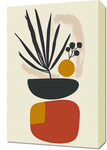 Obraz z serii boho zatytułowany Botaniczny Wgląd.Grafika łączy organiczną formę roślin z abstrakcyjnymi, geometrycznymi kształtami, tworząc kompozycję, która jest zarówno nowoczesna, jak i naturalna. Czarne, eleganckie liście wyłaniają się z ciemnej, okrągłej doniczki, kontrastując z ciepłymi odcieniami pomarańczu i żółci, które mogą symbolizować słońce lub owoc. Delikatne, nieregularne pociągnięcia pędzlem w tle nadają dziełu głębi i tekstury, dodając do czystych linii i bloków kolorów ciepło i ruch. Obraz wprowadzi do wnętrza życie i sztukę w dosłowny sposób, będąc idealnym akcentem w przestrzeniach, gdzie chce się połączyć sztukę współczesną z elementami naturalnymi, takimi jak salony, przestrzenie mieszkalne, czy biurowe, a nawet miejsca takie jak kawiarnie i butiki, które cenią sobie spokój i harmonię.