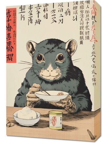 Obraz z serii motywy wschodnie zatytułowany Chwila Refleksji. Intrygujące spojrzenie gryzonia w tradycyjnym stroju, podkreślane przez błękitną tunikę i precyzyjne detale, które nadają mu humanoidalnego charakteru. Czerwone naczynia oraz kanji w tle kontrastują z jasnymi barwami obrazu, dodając nuty głębi i dziedzictwa kulturowego. Subtelna gra światła i cienia na stoliku z jedzeniem i napojem wzbogaca kompozycję i zachęca do refleksji nad połączeniem tradycji z nowoczesnością. Świetnie sprawdzi się w kawiarniach o azjatyckim klimacie, galeriach sztuki oraz w przestrzeniach dedykowanych kulturze Wschodu.
