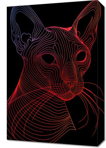 Obraz z serii pop art zatytułowany Cyfrowa Kocica przedstawia futurystyczny wizerunek kota sfinksa, wykonany za pomocą płynnych, abstrakcyjnych linii w odcieniach czerwieni i pomarańczu na głębokim, czarnym tle. Wzór linii tworzy iluzję trójwymiarowości i ruchu, podkreślając wyraziste cechy kociego profilu, takie jak duże uszy, wyłaniające się oczy i charakterystyczne rysy twarzy. Minimalistyczne użycie koloru i linii w kontraście z ciemnym tłem nadaje dziełu nowoczesny wygląd, który przyciąga wzrok i pobudza wyobraźnię. Ten artystyczny obraz świetnie wpisze się w wnętrza o nowoczesnym designie, szczególnie wśród miłośników zwierząt i miłośników sztuki cyfrowej, nadając przestrzeni odrobinę współczesnego stylu i kociego wdzięku.