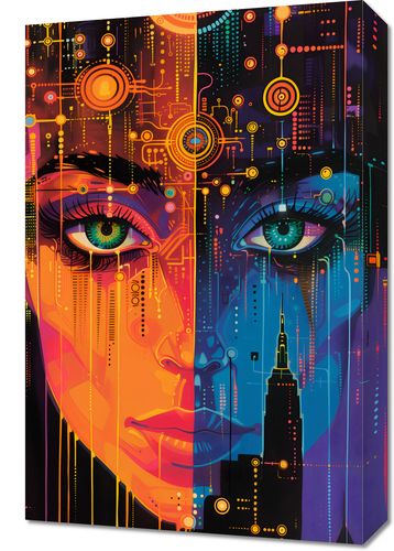 Obraz z serii abstrakcja zatytułowany Cyfrowa Psyche. Przedstawia fascynującą symetrię między ludzką urodą a technologicznym zawirowaniem. Wyraźne, zielone oczy kobiety są centralnym punktem obrazu, ożywione wizją elektronicznych obwodów i cyfrowych sygnałów, które przepływają przez i wokół jej wizerunku. Przecinające twarz linie symbolizują połączenie osobowości z nowoczesnymi technologiami, podczas gdy tło ukazuje zarys charakterystycznego krajobrazu miejskiego. Intensywne, neonowe kolory od pomarańczowego do niebieskiego nadają dziełu dynamiczny i nowoczesny charakter. Obraz ten będzie idealnym dodatkiem do współczesnych biur, salonów gier lub innych przestrzeni kreatywnych, które celebrują połączenie sztuki i technologii.