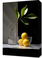Obraz z serii wnętrza zatytułowany Cytrusowa Aranżacja . Ten obraz prezentuje minimalistyczną aranżację składającą się z jasnych, soczystych cytryn ułożonych w przezroczystej misce, akompaniowanych przez pojedynczą, zieloną gałązkę delikatnie wystającą z wysokiego szklanego naczynia. Kompozycja ta, umieszczona na kontrastującym tle, z subtelnymi cieniami i odbiciami światła, sprawia, że scena tętni życiem, mimo swojej prostoty. Idealny do nowoczesnych kuchni, jadalni lub jako odświeżający akcent w przestrzeniach biurowych, ten plakat wnosi element naturalności i czystości do każdego wnętrza.