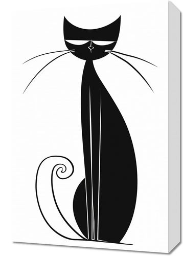 Obraz z serii abstrakcja zatytułowany Czerń Kocicy. Przedstawia minimalistyczną, stylizowaną ilustrację czarnego kota. Postać kota charakteryzuje się wydłużonym, smukłym ciałem z długimi, subtelnymi liniami, które tworzą elegancką i uproszczoną formę. Kot posiada duże, wyraziste oczy i długie wąsy, które dodają mu charakteru, a zakrzywiony ogon w kształcie spirali dodaje dynamiki kompozycji. Całość jest utrzymana w czarno-białej kolorystyce, co nadaje projektowi nowoczesnego i wyrafinowanego wyglądu. Obraz ten idealnie sprawdzi się jako dekoracja w nowoczesnych wnętrzach, wprowadzając element zaskakującej prostoty i elegancji.