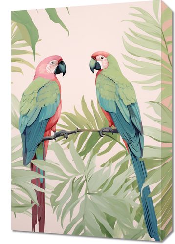 Obraz z serii wnętrza zatytułowany Dialog Ara. Na tej jasnej i pełnej życia ilustracji widzimy dwie papugi ary, które z gracją spoczywają na gałęzi, otoczone tropikalnymi liśćmi palm. Ich wyraziste, kolorowe upierzenie w odcieniach różu, zielonego i błękitu przyciąga wzrok i wprowadza egzotyczną atmosferę do każdej przestrzeni. Obraz ten jest idealnym wyborem dla miłośników natury i kolorowych, radosnych motywów, doskonale nadaje się do wnętrz, które pragną dodać odrobinę tropikalnego ciepła, takich jak jasne salony, dziecięce pokoje, a także jako dekoracja w kawiarniach i restauracjach o egzotycznym charakterze.