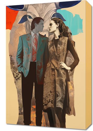 Obraz z serii abstrakcja zatytułowany Dialog Kultur. Ten unikalny obraz przedstawia mężczyznę i kobietę w tradycyjnych strojach, stojących na tle abstrakcyjnego wizerunku byka, który może symbolizować siłę i dziedzictwo kulturalne. Ich ubiory, pełne tekstur i wzorów, w połączeniu z modernistycznym tłem, odzwierciedlają zetknięcie się różnych epok i wartości. Obraz wyraża ideę harmonii pomimo różnorodności, łącząc w sobie elementy historyczne z nowoczesną abstrakcją. Jest to doskonały wybór dla przestrzeni celebrujących różnorodność i bogactwo kulturowe.