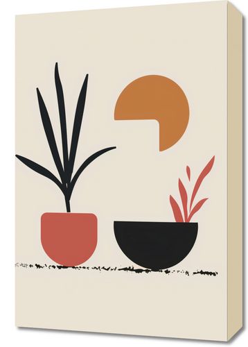 Obraz z serii boho zatytułowany Domowy Ogród. Obraz łączy proste, geometryczne formy roślin z ciepłą kolorystyką, tworząc przytulny obraz domowego ogrodu. Czerwony i czarny wazon z roślinnością wyrastają nad delikatną linia ziemi, przywołując obrazy spokojnego wnętrza. Niedokończony półksiężyc w kolorze pomarańczowym dodaje kompozycji delikatności i podkreśla domową atmosferę. Dzieło doskonale nadaje się do miejsca, które ma być oazą spokoju i relaksu, takiego jak sypialnia lub cichy kącik do czytania. Jego proste i spokojne kolory mogą również przynieść harmonię do miejsca pracy lub studiowania, promując skupienie i spokój.