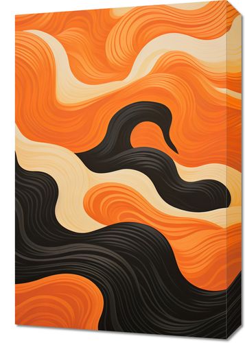 Obraz z serii abstrakcja zatytułowany Dzień spotyka Noc. Falujące wzory przypominają o zachodach słońca na horyzoncie, gdzie słońce zanika za krętą linią nocy. Wzory w odcieniach pomarańczu i złota ścierają się z głęboką czernią, tworząc harmonijną grę świateł i cieni. Te przenikające się kolory dodają obrazowi energii i dynamiki, prowadząc nas przez krajobraz zmieniającego się dnia. Kontrast pomiędzy ciepłymi i chłodnymi tonami przyciąga wzrok i wciąga w głąb kompozycji. Idealny dla nowoczesnych kawiarni, artystycznych przestrzeni oraz domowych salonów pragnących wprowadzić nutę spokoju i refleksji.