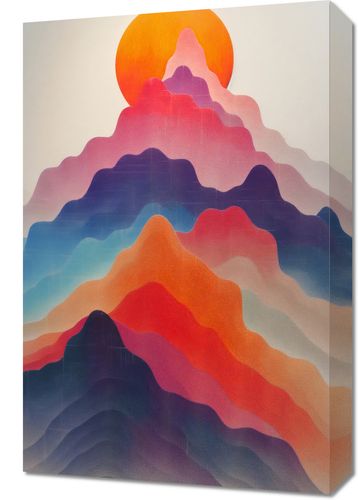 Obraz z serii abstrakcja zatytułowany Gama Gór to stylizowane przedstawienie majestatycznych gór, które tworzą warstwowe pasmo kolorów od głębokiego fioletu poprzez róż, czerwień, aż po ciepłe odcienie pomarańczu i żółci. Ta abstrakcyjna interpretacja krajobrazu górskiego z dużym, słońcem w odcieniach intensywnego pomarańcza w tle, nadaje dziełu atmosferę spokoju i medytacyjnej głębi. Delikatne tekstury i przejścia tonalne między warstwami nadają ilustracji poczucie trójwymiarowości i dynamiki. Obraz idealnie komponuje się z przestrzeniami, które cenią sobie naturę i spokój, nadając wnętrzom charakteru i głębi, doskonały do salonów, przestrzeni wellness, pokojów medytacyjnych lub jako akcent w nowoczesnych biurach.
