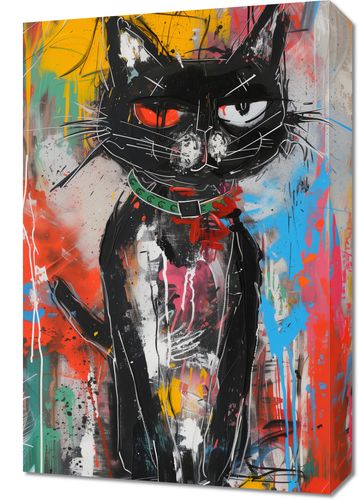 Obraz z serii abstrakcja zatytułowany Gburowaty Kiciak to odważne, street artowe przedstawienie czarnego kota z intensywnymi, czerwonymi oczami. Postać kota, zarysowana grubymi, dynamicznymi liniami, wyróżnia się na tle żywego, kolorowego graffiti. Dzieło łączy w sobie surowość miejskiego stylu z komicznym przedstawieniem zwierzęcia, co nadaje mu niepowtarzalny charakter. Drobne białe akcenty na sierści kota oraz wyraziste spojrzenie tworzą efekt, który przyciąga i utrzymuje wzrok obserwatora. Ten obraz, pełen energii i miejskiego ducha, doskonale odzwierciedla współczesną kulturową estetykę i będzie stanowił wyrazisty element dekoracyjny w nowoczesnych przestrzeniach takich jak loftowe apartamenty, kawiarnie i przestrzenie kreatywne.