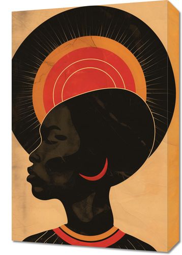 Obraz z serii abstrakcja zatytułowany Gorące Promienie to urzekający portret profilu kobiety, który wyraża siłę i spokojną godność. Jej sylwetka jest wyraźna i zdecydowana, z podkreślonymi, mocnymi liniami, a tło za jej głową tworzy aureolę w ciepłych odcieniach, od ciemnego poprzez jaskrawe odcienie pomarańczu do złota, co może symbolizować wschód lub zachód słońca. Te koncentryczne kręgi przypominają również halo, które często widnieje na obrazach świętych lub ikonach, nadając postaci niemal boski wymiar. Czarny kolor sylwetki w połączeniu z bogatymi, złotymi odcieniami tworzy mocny kontrast, który przyciąga wzrok i sugeruje tajemnicę oraz niezwykłą wewnętrzną siłę. Obraz ten jest elegancki i wyrazisty, doskonały do każdego wnętrza, w którym chce się podkreślić piękno, siłę i kulturowe bogactwo.