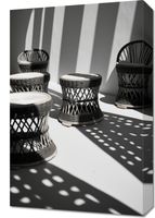 Obraz z serii wnętrza zatytułowany Gra Świateł to stylowa, monochromatyczna fotografia, która oddaje estetykę współczesnego designu. Na fotografii widzimy zestaw eleganckich, plecionych stołków z rattanu ustawionych na tle geometrycznych cieni. Ostre linie cieni przełamują okrągłe kształty mebli, tworząc fascynującą kompozycję pełną kontrastów. Białe siedziska stołków pięknie kontrastują z ciemniejszymi elementami, a gra światła i cienia nadaje scenie trójwymiarowość i teksturę. Obraz ten będzie doskonały dla miłośników minimalistycznych wnętrz, a także dla osób poszukujących elementu dekoracyjnego, który wprowadzi do pomieszczenia nowoczesny i artystyczny akcent. Idealny do nowoczesnych przestrzeni mieszkalnych, biur, kawiarni lub galerii sztuki.