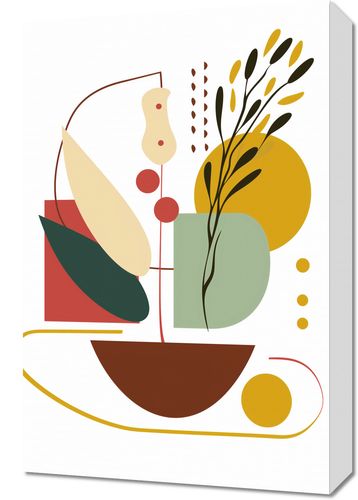 Obraz z serii minimalistyczne zatytułowany Harmonia Natury Martwej. Grafika ta to nowoczesna interpretacja klasycznego motywu natury martwej, gdzie geometryczne formy łączą się z delikatnymi roślinnymi akcentami. Paleta barw jest ciepła i ziemista, z akcentami głębokiego czerwieni, spokojnych zieleni i musztardowych żółci, wszystkie umieszczone na jasnym tle, co nadaje pracy subtelność i lekkość.Ten obraz świetnie komponuje się z wnętrzami, które cenią sobie spokój i równowagę, a także z przestrzeniami, które chcą wnieść do swojego otoczenia sztukę inspirowaną naturą. Może być wyjątkowym dodatkiem do salonu, przestrzeni relaksacyjnej, czy jako estetyczny akcent w jadalni.