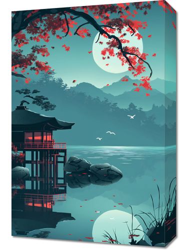 Obraz z serii motywy wschodnie zatytułowany Japoński Pawilon. Ten obraz emanuje spokojem dzięki scenie przedstawiającej tradycyjny japoński pawilon, otoczony przez wodę i delikatnie pochylające się czerwone liście klonu. Ciepłe światło wschodzącego księżyca i subtelne odbicie w wodzie podkreślają atmosferę ciszy i refleksji. Delikatne sylwetki przelatujących ptaków dodają element życia i ruchu. Obraz ten idealnie wpisuje się w przestrzenie współczesne, minimalistyczne, a także te, które celebrują naturę i spokój, takie jak pokoje do medytacji, jadalnie, czy też poczekalnie w spa.