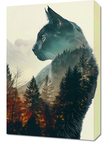 Obraz z serii natura zatytułowany Koci Duch Lasu. Ten obraz prezentuje zaskakującą kompozycję, w której sylwetka czarnego kota płynnie przechodzi w mglisty krajobraz leśny, łącząc świat zwierzęcia z dziką przyrodą. Złote i ciepłe odcienie jesiennego lasu w tle kontrastują z chłodnymi tonami gór, dodając głębi i tajemniczości. Mistyczne połączenie kota z naturą symbolizuje jedność i harmonię między żywymi istotami a otoczeniem, a także podkreśla dziką i niezależną naturę kota. Obraz idealnie nadaje się do przestrzeni mieszkalnych ceniących połączenie sztuki z naturą, takich jak nowoczesne salony, pokoje relaksacyjne lub gabinety, jak również może być inspirującym elementem dekoracyjnym dla gabinetów weterynaryjnych lub przychodni zoologicznych.