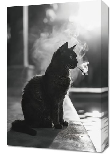 Obraz z serii wnętrza zatytułowany Kocia Przerwa. Na tym obrazie uwieczniono czarnego kota siedzącego na krawędzi, zanurzonego w promieniach rozproszonego światła, które podkreślają jego błyszczącą sierść i wyraziste kontury. Kocie wąsy delikatnie zarysowane w kontraście ze światłem nadają mu wyrazistości, a unoszący się dym tworzy aurę tajemniczości. Jest to obraz zarówno elegancki, jak i zagadkowy, idealny dla miłośników zwierząt i minimalistycznego designu. Obraz ten będzie pasował do każdego wnętrza, od klasycznego po nowoczesne, dodając subtelnego charakteru i spokoju.