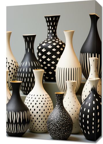 Obraz z serii wnętrza zatytułowany Kontrast i Harmonia. Eleganckie wazony w subtelnych odcieniach bieli i intensywnej czerni stoją dumnie na szarości tła. Geometryczne i abstrakcyjne wzory, które zdobią te wazony, przypominają tętniącą życiem tańczącą symfonię. Kropki, linie i formy tworzą intrygującą kompozycję, która przyciąga wzrok i dodaje wnętrzom wyjątkowej głębi. Subtelna gra świateł i cieni, a także kontrast między monochromatycznymi barwami, dodaje tej kolekcji odrobinę tajemniczości. Będzie to idealne dopełnienie zarówno dla nowoczesnych przestrzeni loftowych, jak i eleganckich salonów z naciskiem na design. Ten wyjątkowy plakat doskonale odnajdzie się w galeriach sztuki oraz w luksusowych hotelach.