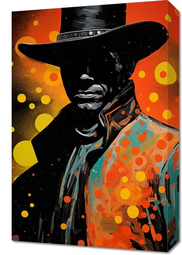 Obraz z serii pop art zatytułowany Kowboj Kosmosu. Ta ilustracja przedstawia postać kowboja, której sylwetka jest zarysowana na tle kosmicznej palety barw z akcentami żywych pomarańczy i ciepłych żółci. Wzór obrazu przypomina współczesną interpretację klasycznych westernowych motywów, połączonych z abstrakcyjnymi, dynamicznymi kształtami i kropkami, przywodzącymi na myśl gwiazdy i galaktyki. Obraz ten jest idealnym wyborem dla miłośników nowoczesnej sztuki oraz tych, którzy cenią sobie odważne połączenie tradycyjnych tematów z nowoczesnym designem, doskonale nadaje się do wnętrz o męskim charakterze, takich jak męskie jaskinie, studia projektowe, a także jako silny wizualny akcent w przestrzeniach publicznych.