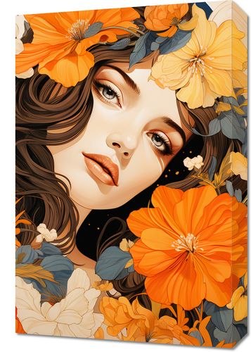 Obraz z serii natura zatytułowany Kwiatowa Esencja. Hipnotyzujące spojrzenie kobiety otoczonej eksplozją jaskrawych kwiatów podkreśla jej głęboką więź z przyrodą. Jej lśniące włosy splatają się z płatkami, a promieniejące oczu odzwierciedlają bogactwo i różnorodność przyrody. Płynące linie i bogate kolory sprawiają, że kompozycja jest niczym zjawiskowy ogród pełen życia i pasji. Wspaniale wpisuje się w wnętrza inspirowane motywami kiatowymi i kawiarniach