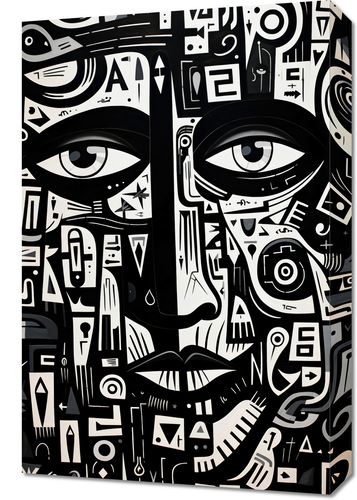 Obraz z serii abstrakcja zatytułowany Labirynt Myśli. Intrygujące oczy spoglądające z głębi obrazu są otoczone złożonymi wzorami i symbolami, które łączą się, tworząc enigmatyczny portret. Czarno-białe barwy kontrastują ze sobą, dodając dziełu intensywności i głębi. Złożoność wzorów symbolizuje skomplikowane myśli i emocje, które kryją się za ludzkim spojrzeniem. Świetnie sprawdzi się w nowoczesnych biurach, galeriach sztuki oraz w przestrzeniach przeznaczonych dla miłośników abstrakcyjnej ekspresji.