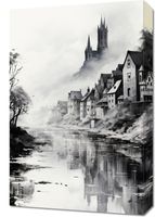 Obraz z serii pejzaże zatytułowany Mglisty Refleks. Misterne pociągnięcia pędzla przedstawiają starą wieś schowaną w mrocznych zakątkach gór, z dominującymi wieżami kościoła wznoszącymi się nad nią. Mgła otulająca krajobraz i odbicie w spokojnej wodzie tworzą atmosferę tajemniczości i zadumy. Monochromatyczna paleta barw dodaje głębi i intensywności całemu obrazowi, czyniąc go idealnym wyborem dla klasycznych salonów oraz miejsc takich jak kawiarnie o historycznym charakterze czy ekskluzywne kluby dyskusyjne.